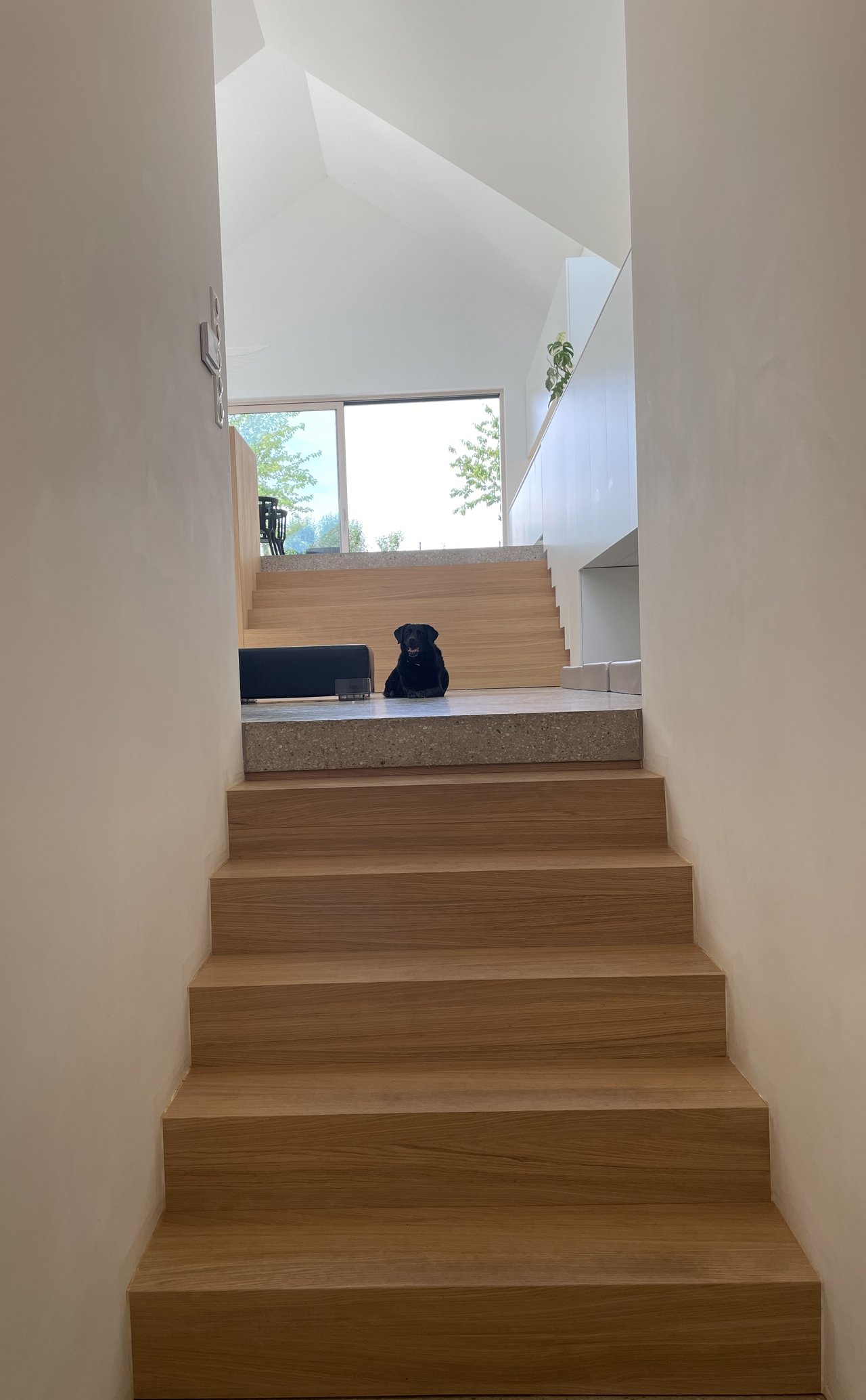 Ein Multifunktionsmöbel, das sich über einen Halbstock formt. Es bietet einen geschützten und beleuchteten Platz für die Hunde, versteckt den Fernseher und bietet ausreichend Stauraum.