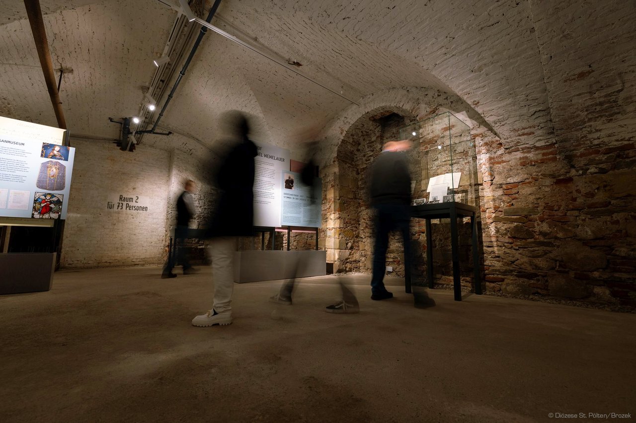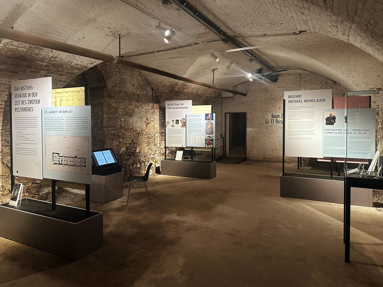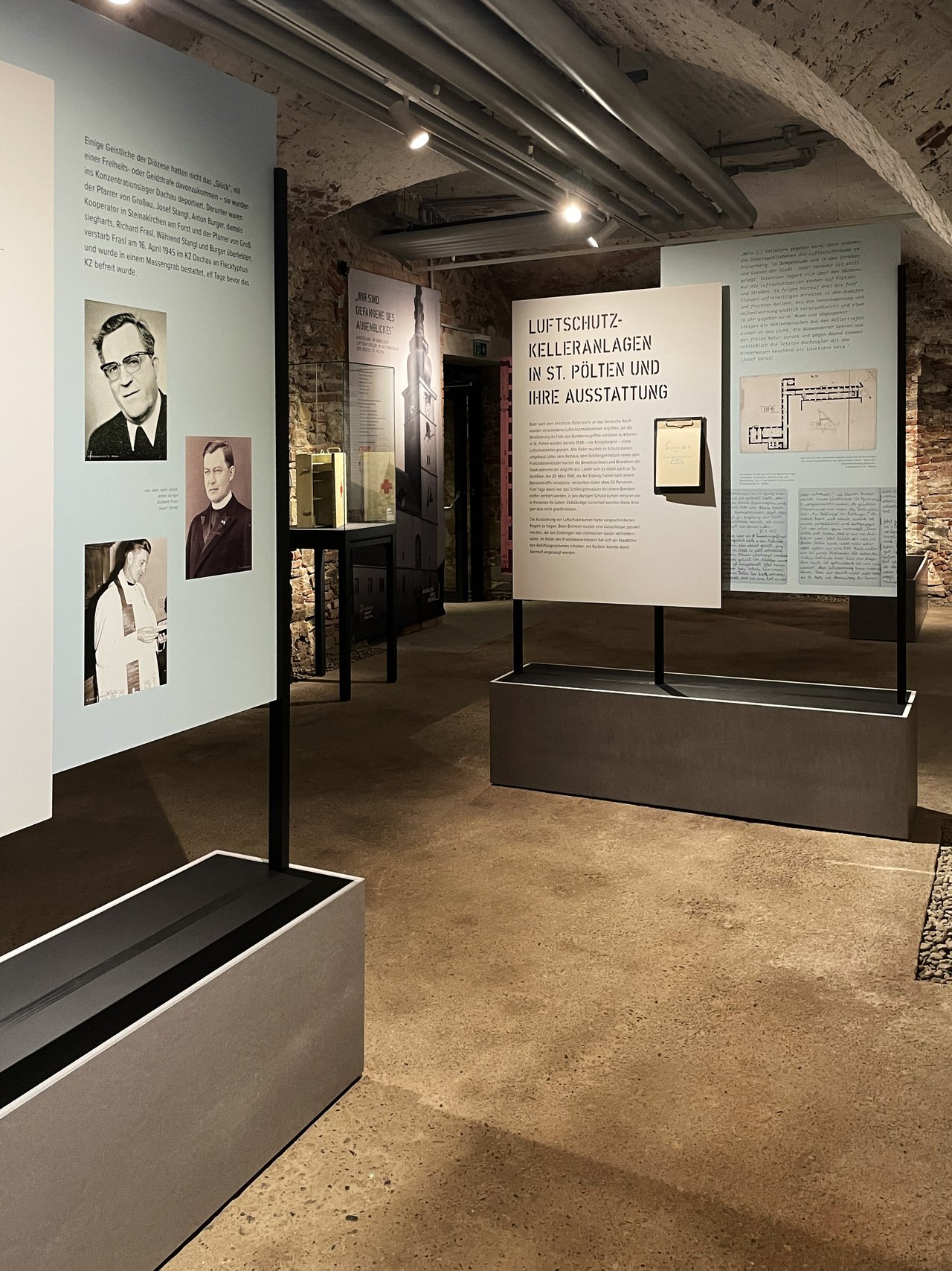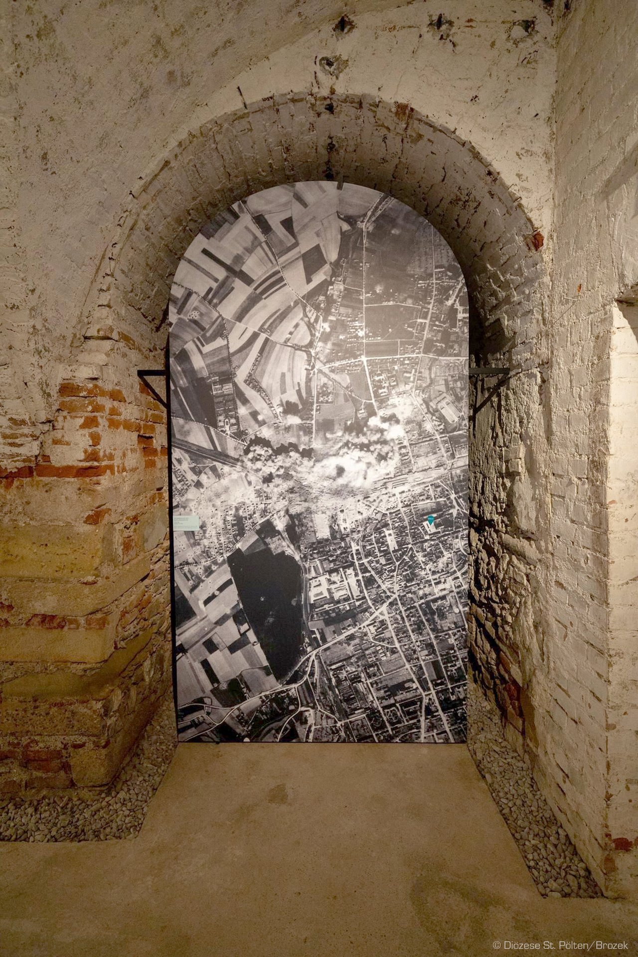 Der ehemalige Luftschutzkeller des Bistumsgebäudes war während der Bombenangriffe im Jahr 1945 Zufluchtsort für viele St. PöltnerInnen. Die noch erhaltenden Beschriftungen an den Wänden, Abdeckungen und Einstiegsöffnungen erzählen unmittelbar von diesen Zeiten.