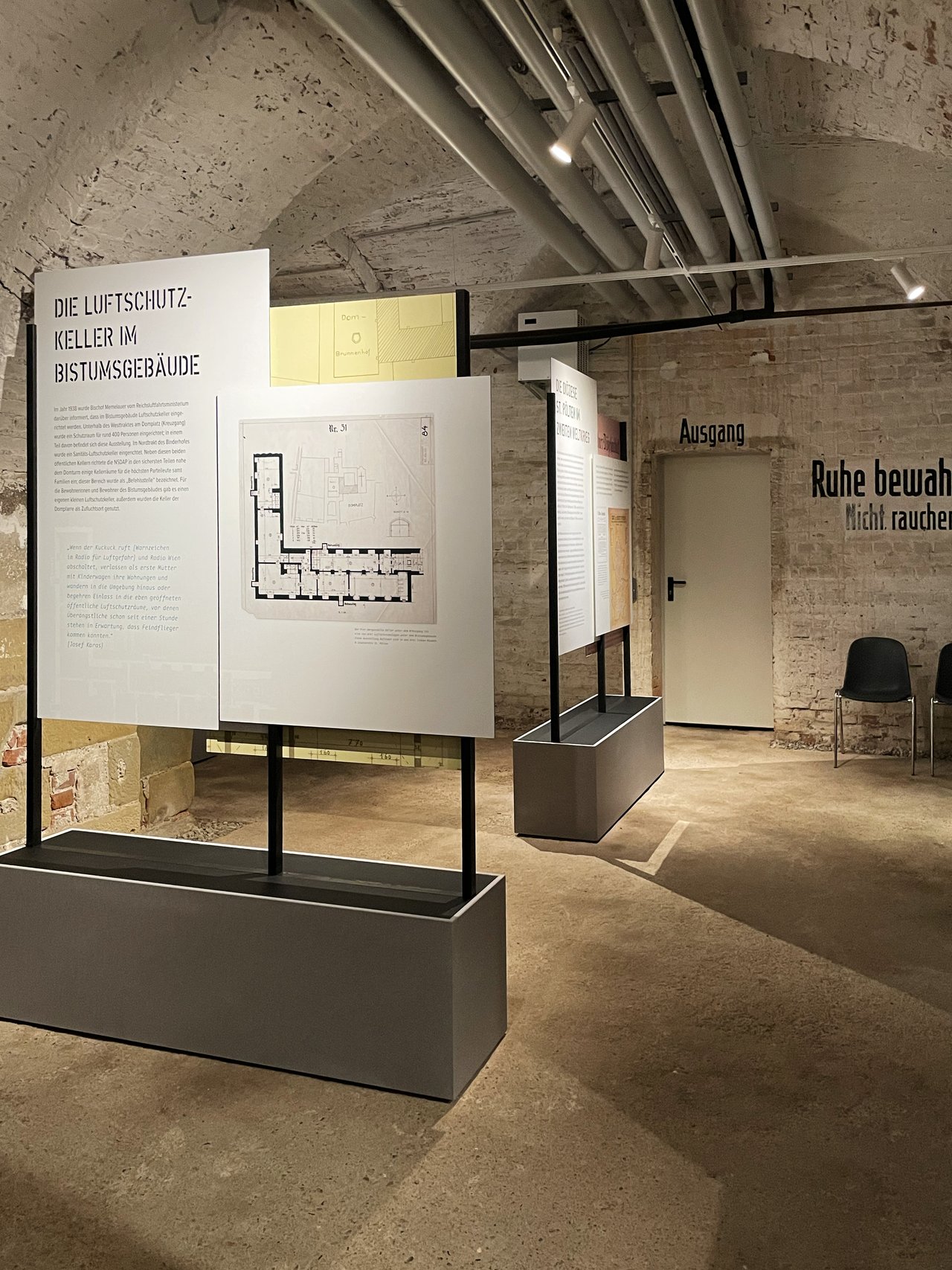 Die frei aufgestellten Ausstellungselemente können auch unter den klimatisch herausfordernden Bedingungen des Kellers bestehen. Die farblich an historische Dokumente angepassten Flächen bieten Einblicke in persönliche Geschichten und zeitgeschichtliche Zusammenhänge.