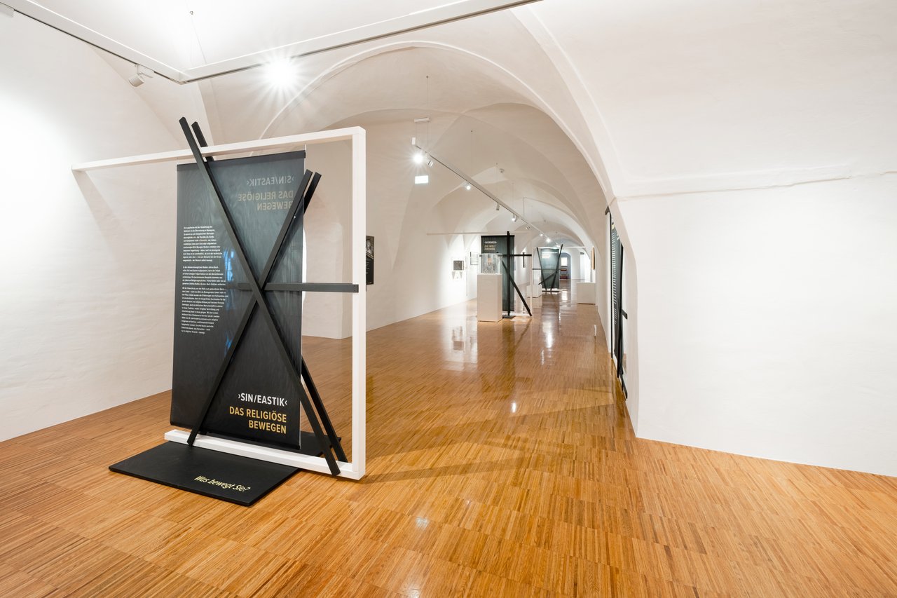 Holzstrukturen gliedern den Raum und zitieren andeutungsweise bekannte religiöser Symbole. Der Moiré-Effekt der mehrlagigen Netzstruktur lässt einen uneindeutigen Blick auf das Dahinter zu und verändert es mit wechselndem Standpunkt.