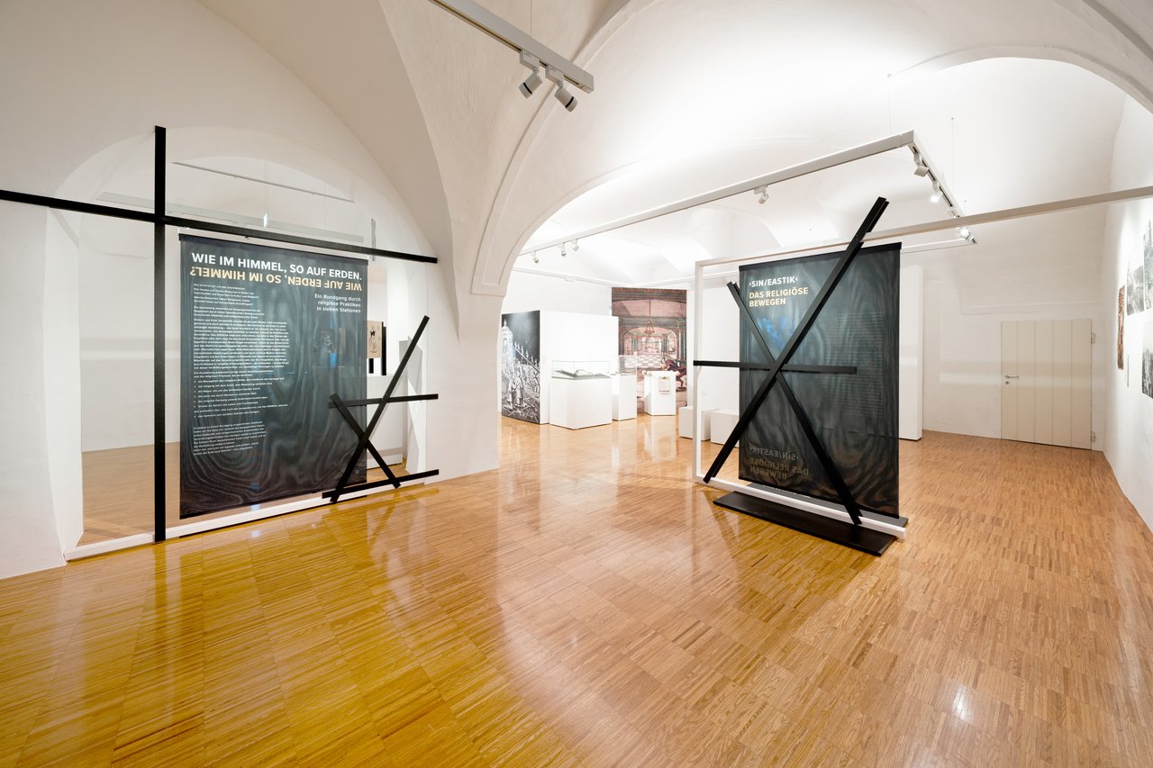“Wie im Himmel, so auf Erden. Wie auf Erden, so im Himmel?” - Objekte, Darstellungen, Filme und Tondokumente, die von unterschiedlichsten religiösen Praktiken aus verschiedenen Zeiten erzählen galt es hier in Szene zu setzen. Diese sind nicht nur in ihrer Größe sehr unterschiedlich: von winzigen Holzspänen bis hin zu einem mehrere Meter langen Rollenbild, vom fein ziselierten Metallanhänger bis zur fast lebensgroßen Statue.